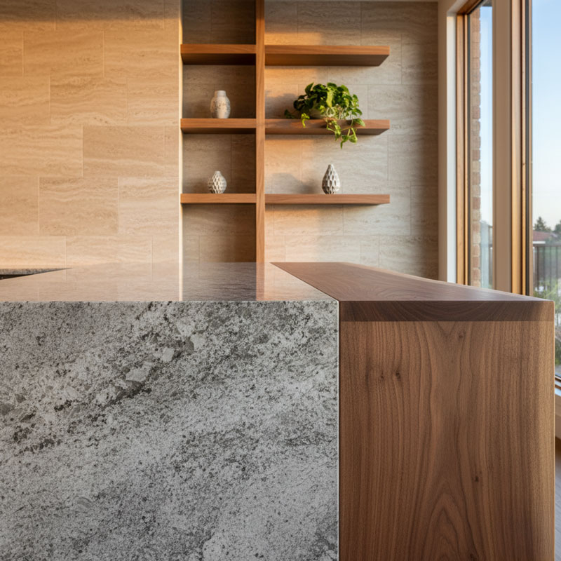 Pour réussir cette association, privilégiez les bois mi-foncés (noyer, teck) avec les pierres claires (marbre de Carrare, calcaire beige), et inversement, les bois clairs (chêne blanchi, frêne) avec les pierres sombres (granit, basalte).