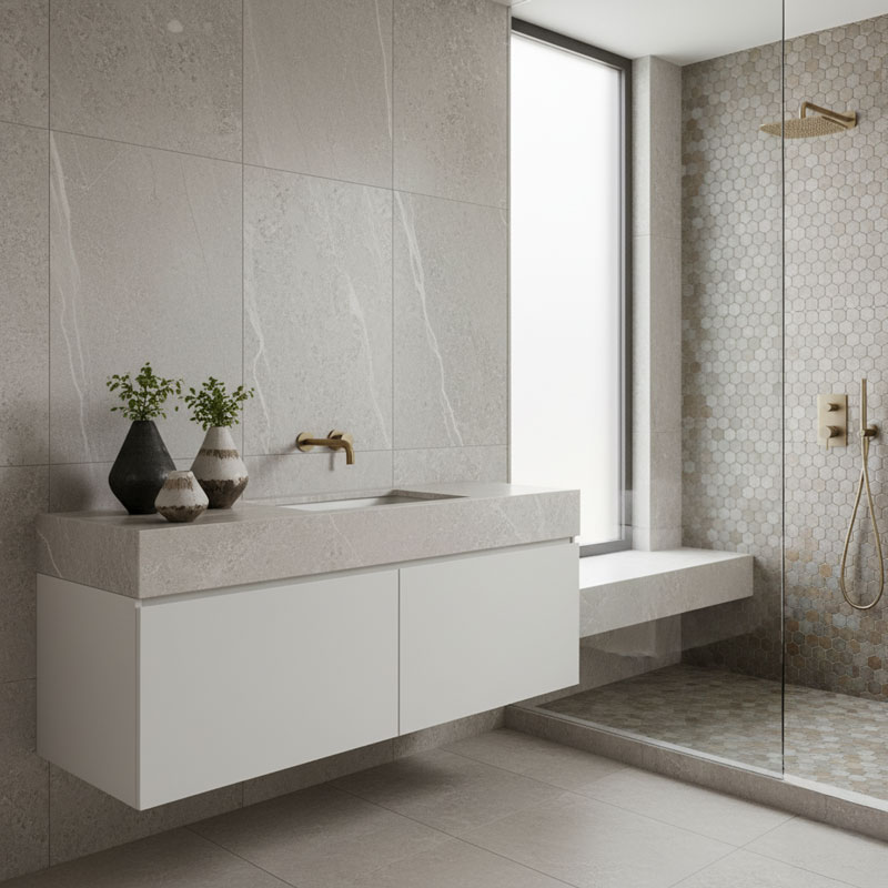 L’association pierre naturelle et céramique technique combine authenticité et performance.