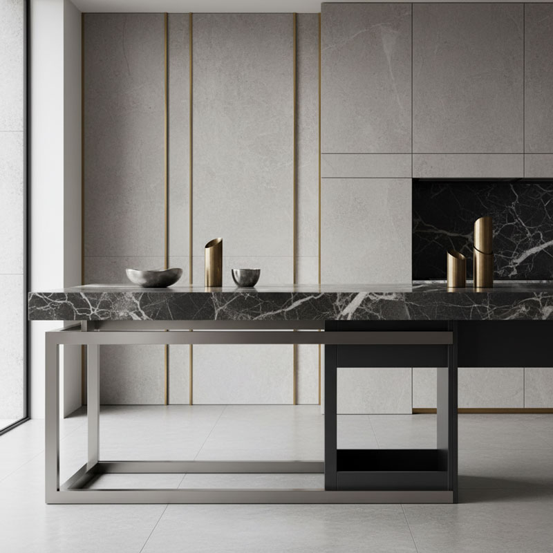 Pour une esthétique résolument contemporaine, mariez un plan de travail en granit poli avec une structure de cuisine en acier inoxydable brossé. Cette alliance robuste convient parfaitement aux cuisines professionnelles domestiques où performance et design s’entremêlent.