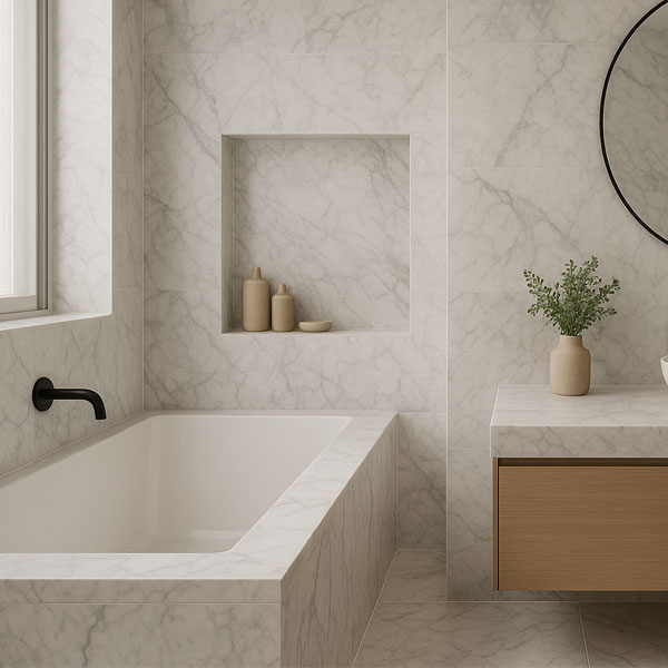Après la cuisine, la salle de bain arrive en tête des priorités des acheteurs. Un revêtement mural en marbre, travertin ou ardoise transforme cet espace fonctionnel en véritable spa personnel. Cette transformation n’échappe pas aux visiteurs qui y projettent instantanément leurs moments de détente.